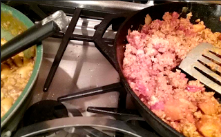 Meanwhile, add onion, coconut oil to saucepan. Cook until translucent, add garlic, cook 1 min. Add ground beef or turkey, cook until cooked through, add salt and pepper.
